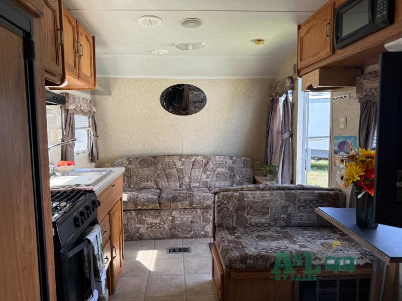 Inside, the Palomino Puma 19 FS is thoughtfully designed to maximize space and functionality. It comfortably sleeps up to five people, making it suitable for family adventures or trips with friends. The interior layout is efficient, featuring a cozy sleeping area, a functional kitchenette, and a compact dining space that can easily convert to accommodate additional sleeping arrangements. The trailer is equipped with essential amenities to ensure a comfortable stay, including ample storage options to keep your living space organized and clutter-free.