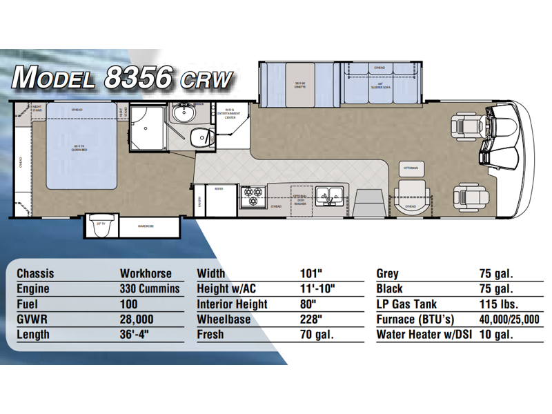 Inside, the Crescendo 8356 CRW is thoughtfully designed to accommodate up to six guests, ensuring that your family and friends can join you on your adventures. The well-appointed living area provides a welcoming atmosphere, featuring plush seating and a dining space that invites you to enjoy meals together. The kitchen is equipped with modern appliances and ample storage, allowing you to prepare and enjoy your favorite dishes while on the road.