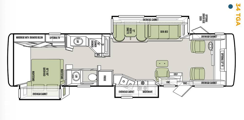 Designed to accommodate up to six people, the Tiffin Open Road 34 TGA features a well-thought-out floor plan that maximizes both living and sleeping areas. The interior boasts high-quality furnishings and finishes, including plush seating and a fully equipped kitchen with modern appliances. The sleeping arrangements include a cozy master bedroom, convertible sofa beds, and additional sleeping space, ensuring restful nights for everyone on board.