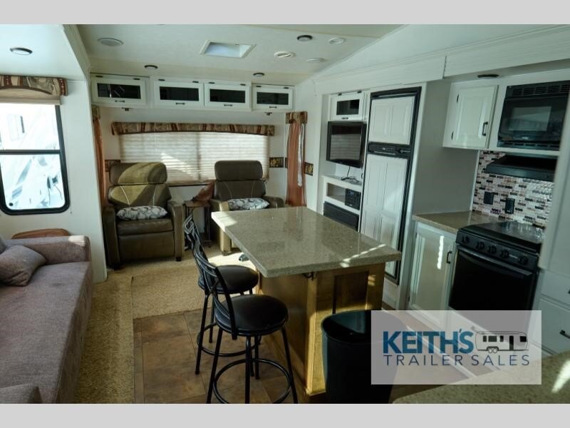 Step inside and be greeted by a warm and inviting interior. The living area features plush seating and a large dining space, perfect for family meals or game nights. The kitchen is fully equipped with modern appliances, including a refrigerator, stove, and microwave, making meal prep a breeze. You'll appreciate the ample storage throughout, ensuring you can bring along all your essentials and more. The RV's clever layout maximizes space, providing a comfortable and functional living environment.