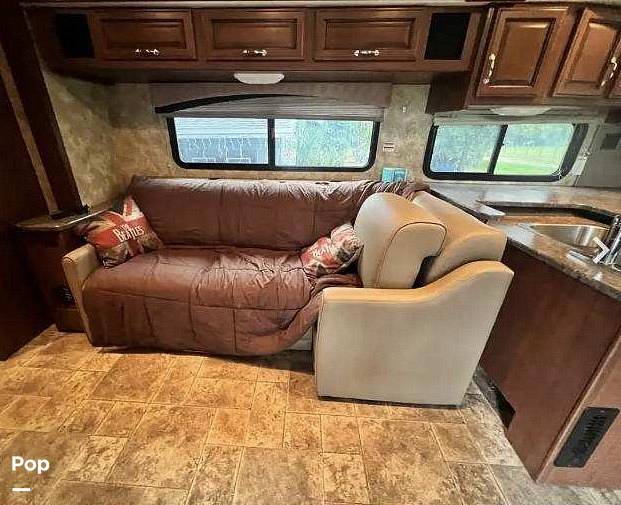 Inside, you'll find a cozy and inviting living space with all the comforts of home. The well-equipped kitchen features a fridge, stove, and microwave, so you can whip up your favorite meals on the go. The dining area is perfect for family dinners or game nights, and the plush seating in the living area is great for relaxing after a day of exploring. With a full bathroom and plenty of storage space, you'll have everything you need to travel in style and comfort.
