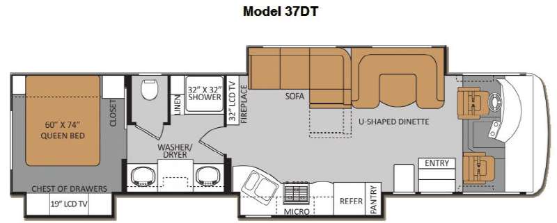 Step inside and be greeted by an expansive interior, thanks to its three slide-outs that significantly increase living space. The Challenger 37DT comfortably sleeps four, making it perfect for family getaways or trips with friends. The master suite features a plush queen-sized bed, while the convertible sofa in the living area provides additional sleeping accommodations. The well-appointed kitchen, complete with a refrigerator, microwave, and stove, ensures you can prepare your favorite meals on the go. The dining area, with its cozy seating, is perfect for enjoying meals or planning your next adventure.