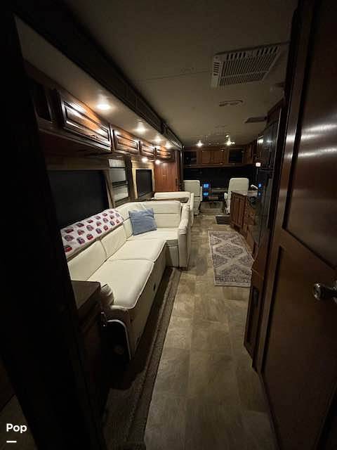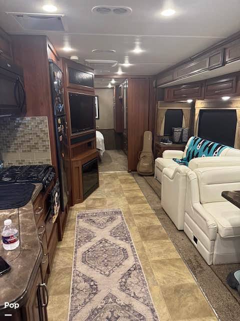 Step inside to find a well-appointed interior featuring a fully equipped kitchen with modern appliances, including a refrigerator, microwave, and stove. The living area offers ample seating with a plush sofa and dinette, perfect for relaxing or enjoying meals together. The master bedroom boasts a comfortable queen-sized bed, while additional sleeping arrangements include a convertible sofa and dinette, ensuring everyone has a restful night's sleep.