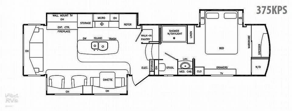Inside, the DRV Tradition 375KPS is thoughtfully designed to accommodate up to four people, ensuring a restful and enjoyable experience for all occupants. The interior boasts high-quality finishes and a well-appointed layout, featuring a fully equipped kitchen with modern appliances, a cozy living area, and a luxurious master suite. The attention to detail is evident throughout, from the elegant cabinetry to the plush seating, creating an inviting atmosphere that feels like home.