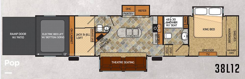 Measuring an impressive 36 feet in length, the Vengeance 38L12 provides ample space for relaxation and entertainment. Inside, you'll find a well-appointed interior featuring a fully equipped kitchen, complete with modern appliances and plenty of storage. The living area is designed for comfort, with plush seating and a large dining space, making it ideal for family meals or game nights. The sleeping arrangements include a master bedroom, bunk beds, and convertible sofas, ensuring everyone has a cozy place to rest.
