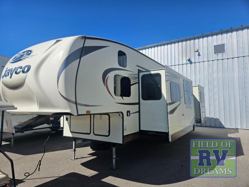 Discover the perfect blend of comfort and adventure with this 2015 Jayco Eagle 295 FBDS Fifth Wheel. Designed to accommodate the whole family, this RV features two spacious slide-outs that create a roomy interior, making it an ideal choice for both short getaways and extended road trips. With a length of 28 feet, this fifth wheel offers a compact yet efficient layout, ensuring you have all the space you need without compromising on maneuverability.