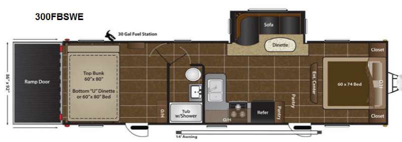 The Keystone Energy 300FBSWE features a single slide-out, significantly enhancing the living area to provide a roomy and inviting atmosphere. Inside, you'll find sleeping accommodations for up to seven people, making it an excellent choice for larger families or groups of friends. The thoughtfully designed interior includes a well-equipped kitchen, a cozy dining area, and a comfortable living space, ensuring that everyone can relax and enjoy their time on the road. The RV's weight is approximately 3,514 kilograms, ensuring a stable and secure ride while still being manageable for towing.