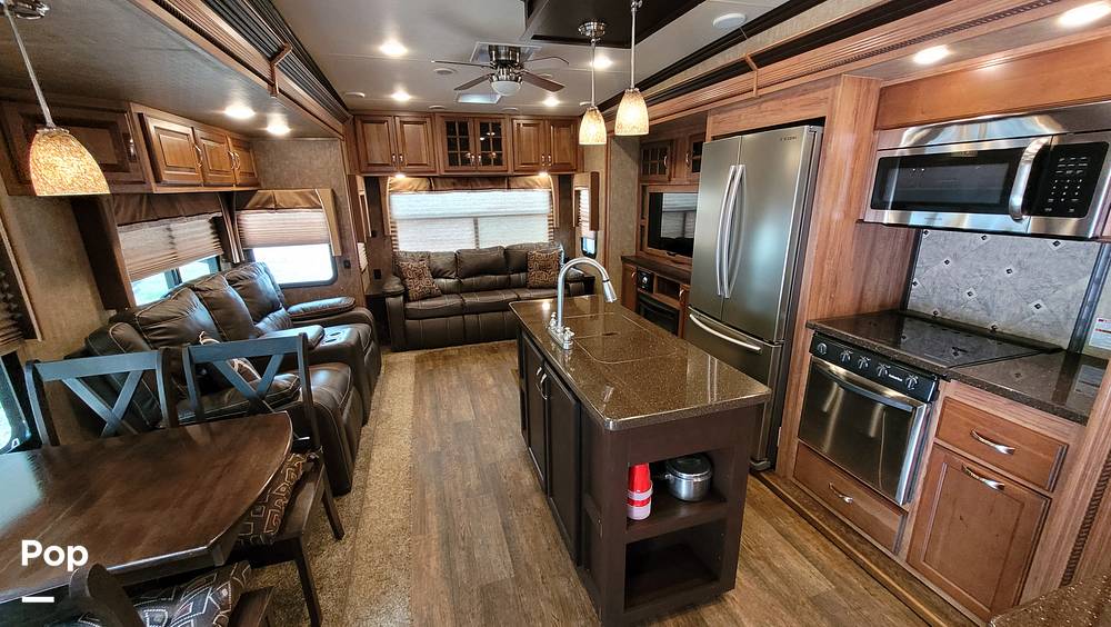 Measuring approximately 34 feet in length, this fifth wheel offers ample space for living and storage. Inside, you'll find a beautifully appointed living area with plush seating and a fully equipped kitchen, perfect for preparing meals on the go. The master bedroom offers a peaceful sanctuary with a comfortable bed and plenty of storage for all your essentials. The additional sleeping area ensures that everyone has a cozy place to rest after a day of adventure. Plus, the spacious bathroom provides all the conveniences of home, making it easy to freshen up after a day in the great outdoors.