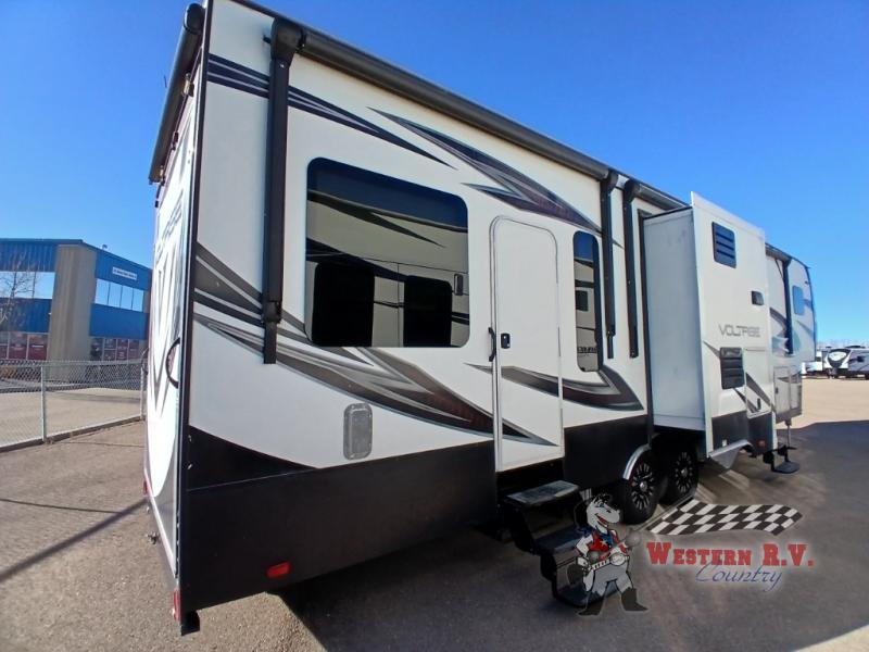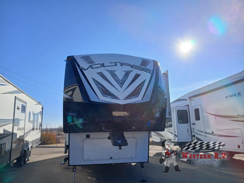 The Voltage 3305 features three strategically designed slide-outs, maximizing interior space and providing a spacious living environment. This model is thoughtfully equipped to accommodate up to seven guests, making it ideal for family vacations or group excursions. The interior layout is both practical and elegant, with high-quality furnishings and modern amenities that cater to your every need. Whether you are preparing a meal in the fully-equipped kitchen or unwinding in the cozy living area, this RV promises a home-like atmosphere on the road.
