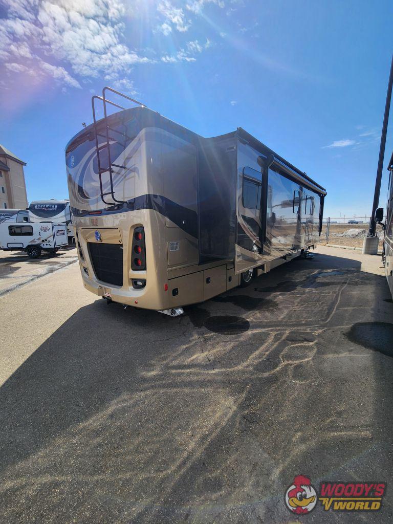 Step inside and be greeted by a spacious interior that boasts a thoughtfully designed layout. The 38-foot length provides ample room for relaxation and entertainment, featuring a fully equipped kitchen with modern appliances, a cozy dining area, and a plush living space perfect for unwinding after a day of exploration. The master bedroom offers a serene retreat with a comfortable queen-sized bed and generous storage options, ensuring you have everything you need for extended travels.