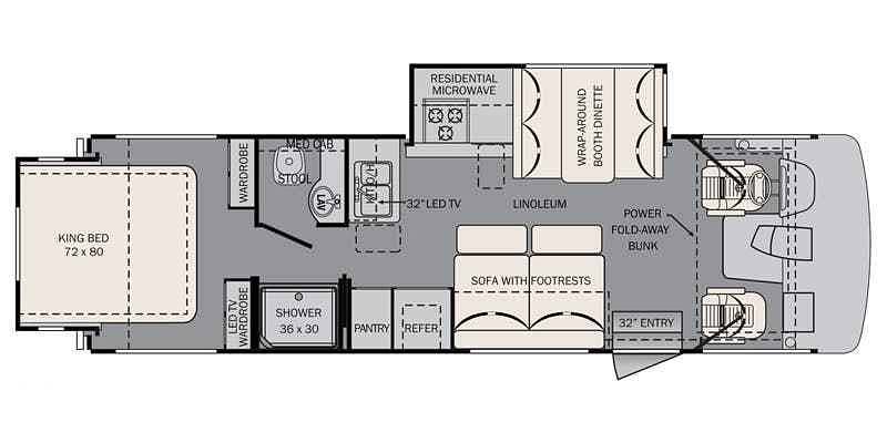 Inside, you'll find a well-thought-out layout that maximizes space and comfort. The living area features plush seating and a convertible dinette, providing ample room for relaxation and dining. The kitchen is fully equipped with modern appliances, including a refrigerator, microwave, and stove, allowing you to prepare meals just like at home. Sleeping arrangements are versatile, with a king-sized bed in the master suite, a bunk over the cab, and additional sleeping options in the living area, ensuring everyone has a cozy place to rest.