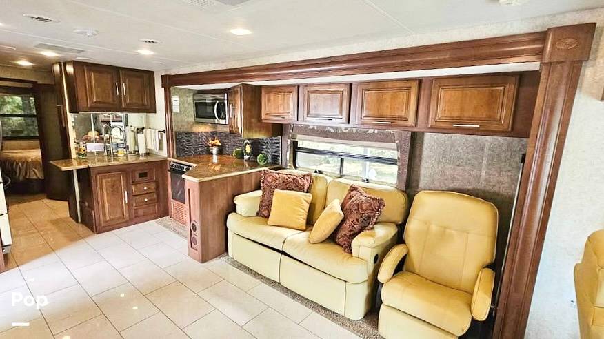 Step inside to find a beautifully designed living space that combines functionality with elegance. The well-appointed kitchen features modern appliances, including a refrigerator, microwave, and stove, making meal preparation a breeze. The cozy living area is perfect for unwinding after a day of adventure, with plush seating and a flat-screen TV for entertainment. The master bedroom offers a comfortable queen-sized bed, while additional sleeping arrangements include a convertible sofa and dinette, ensuring everyone has a restful night's sleep.
