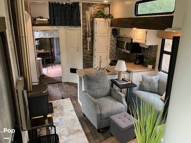 This fifth wheel boasts a thoughtfully designed interior, featuring high-quality finishes and modern amenities to ensure a home-like experience on the road. The living area is equipped with plush seating and a state-of-the-art entertainment system, providing a perfect setting for relaxation after a day of exploration. The fully-equipped kitchen includes a refrigerator, stove, and microwave, allowing you to prepare meals with ease. Additionally, the RV offers ample storage space, ensuring all your travel essentials are conveniently within reach.