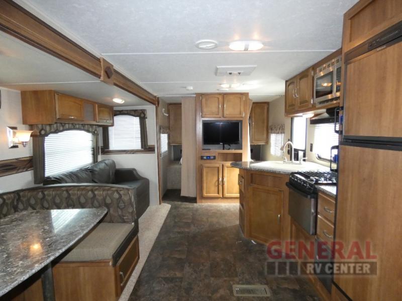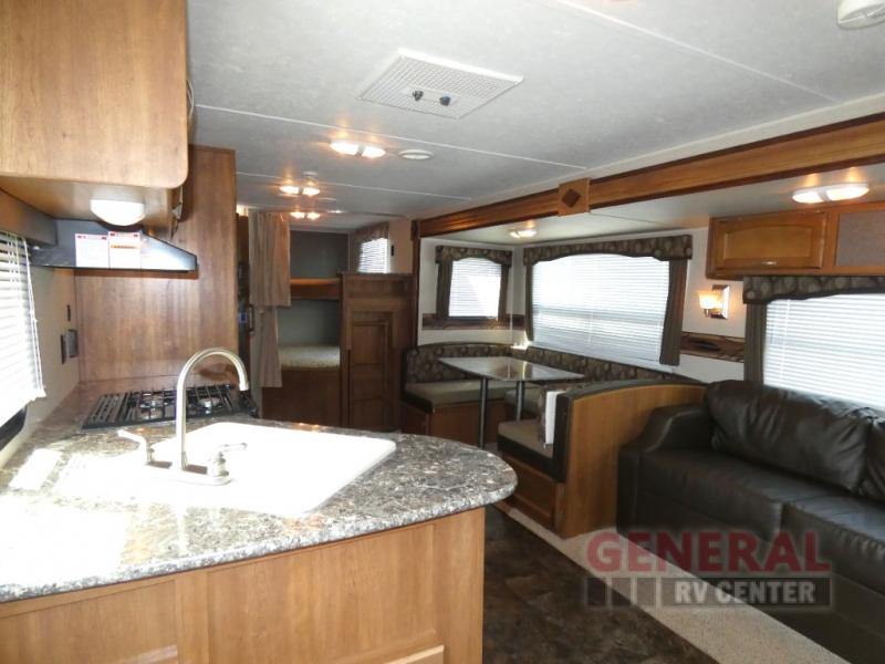 This travel trailer is designed to comfortably sleep up to 9 people, so you can bring the whole family or a group of friends along for the ride. The clever layout includes a cozy bunkhouse, a convertible dinette, and a comfy sofa bed, ensuring everyone has a place to rest after a day of adventure. The single slide-out expands your living space, giving you extra room to relax and enjoy your time indoors.