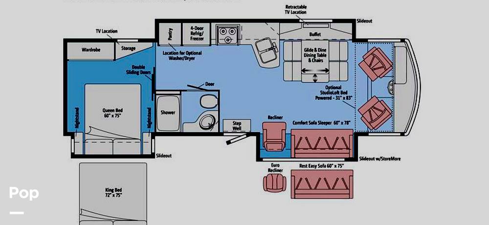 Measuring an impressive 36 feet in length, the Sightseer 36Z provides ample space for relaxation and entertainment. The thoughtfully designed floor plan includes a well-equipped kitchen with modern appliances, a cozy dining area, and a comfortable living space. The master bedroom features a plush queen-sized bed, while the convertible sofa and dinette offer additional sleeping options. The full bathroom is equipped with all the essentials, ensuring you have everything you need for a comfortable journey.