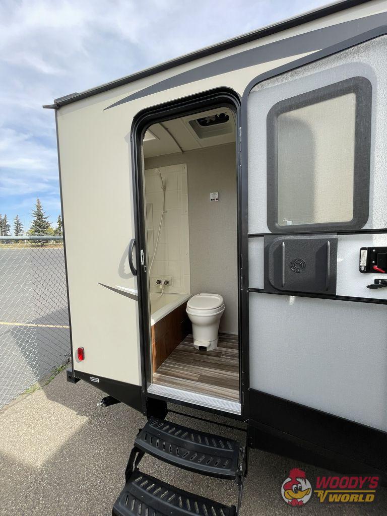 Step inside to find a well-appointed living space featuring a fully equipped kitchen with a refrigerator, microwave, and three-burner stove, all set in a stylish layout that makes meal preparation a breeze. The cozy dinette and plush seating area provide ample room for relaxation and dining. The trailer comfortably sleeps up to six people, with a queen-sized bed in the master bedroom and convertible sleeping areas in the living space. The bathroom is complete with a shower, sink, and toilet, ensuring convenience on the road.