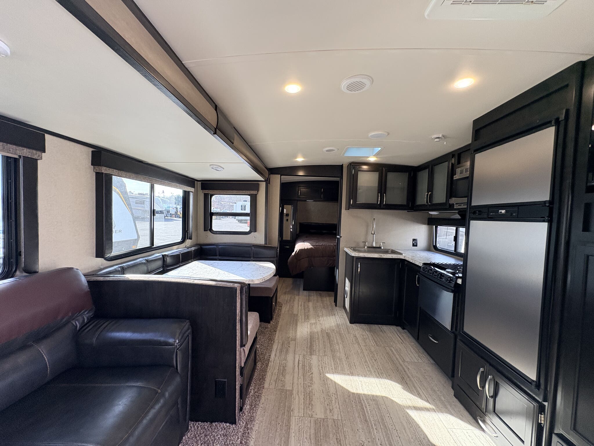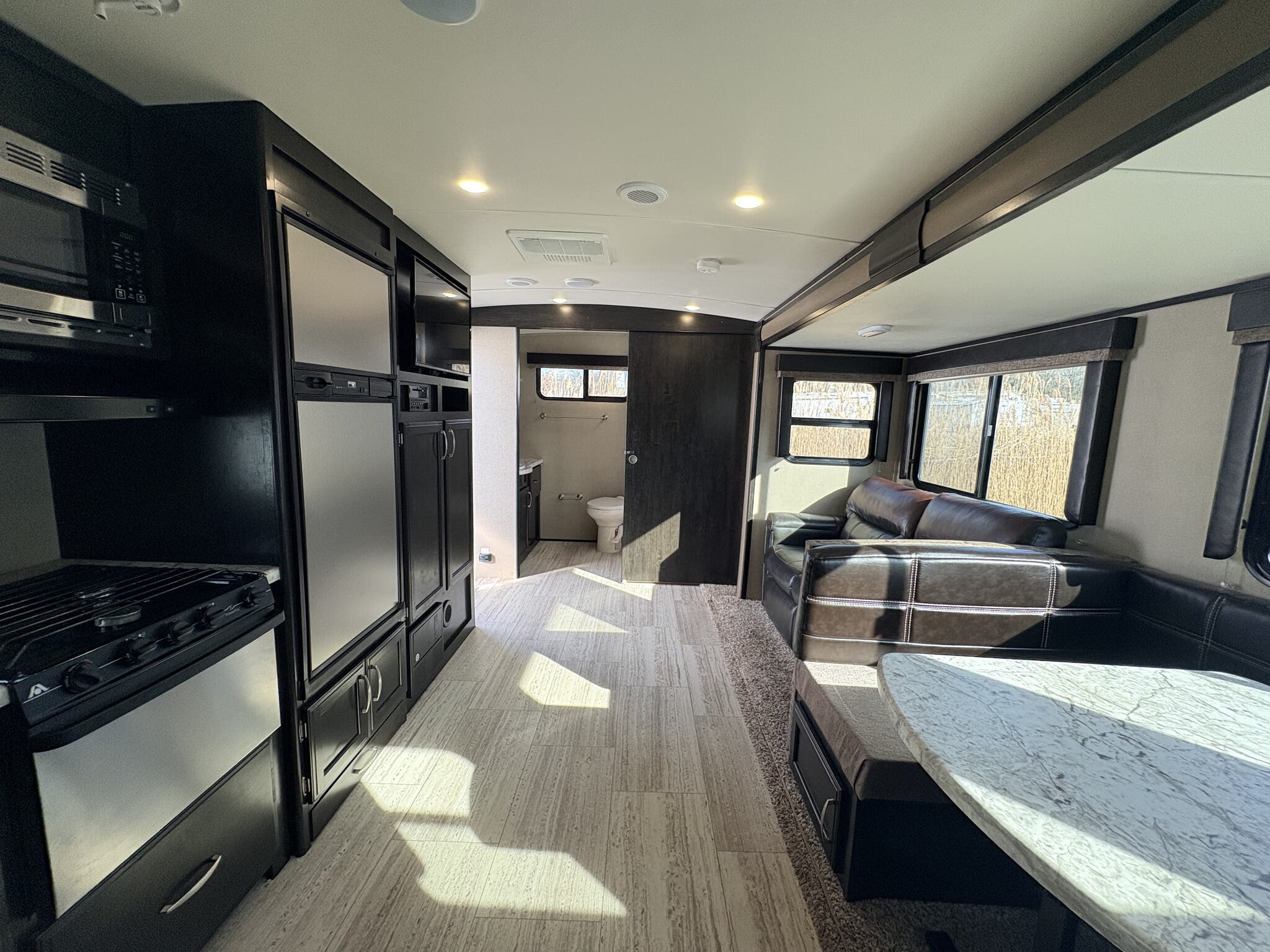 This travel trailer can comfortably sleep up to six people, featuring a cozy master bedroom, a convertible dinette, and a plush sofa bed. The interior is thoughtfully designed with high-quality finishes and modern amenities, ensuring a home-like feel wherever your travels take you. The kitchen is fully equipped with a refrigerator, microwave, and stove, allowing you to prepare meals with ease. The bathroom is spacious and includes a large shower, providing the convenience and privacy you need.