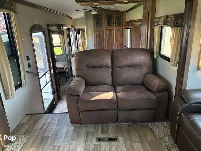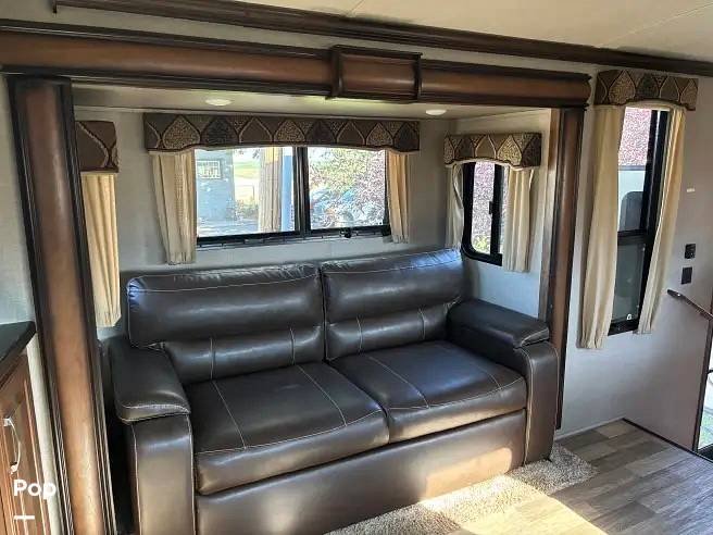 Measuring approximately 33 feet in length, this Fifth Wheel offers ample space without compromising on maneuverability. Inside, you'll find a well-appointed living area with plush seating, perfect for relaxing or entertaining. The kitchen is equipped with modern appliances, making meal prep a breeze, whether you're whipping up a quick breakfast or a gourmet dinner. The dining area is both stylish and functional, providing a great spot for meals or game nights.