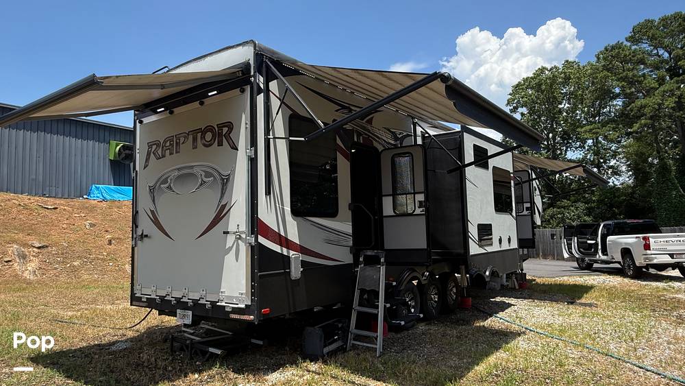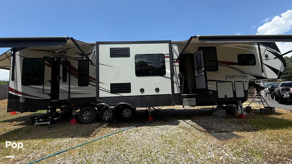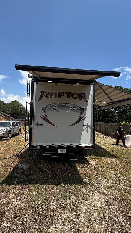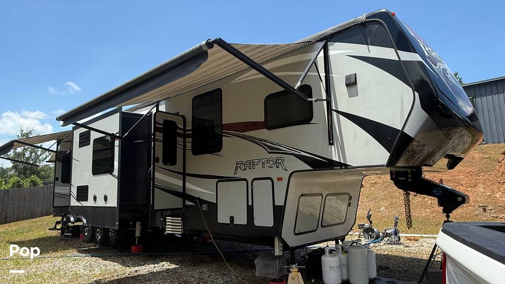 Introducing the 2017 Keystone Raptor Toy Hauler Series M-425 TS Fifth Wheel, a versatile and spacious RV designed to elevate your travel experiences. This impressive fifth wheel measures approximately 35 feet in length, offering ample space for family and friends. With the ability to comfortably sleep up to nine people, it is the perfect choice for those who enjoy traveling with a larger group or simply desire extra room for relaxation and entertainment.