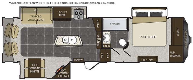 The Alpine 3101RL features three strategically placed slide-outs, significantly enhancing the living space and creating an open, airy atmosphere. Inside, you will find accommodations for up to four people, making it perfect for couples or small families. The interior is thoughtfully designed with high-quality materials and finishes, offering a cozy yet sophisticated environment. The well-appointed kitchen, complete with modern appliances, allows for convenient meal preparation, while the inviting living area provides a perfect setting for relaxation and entertainment.