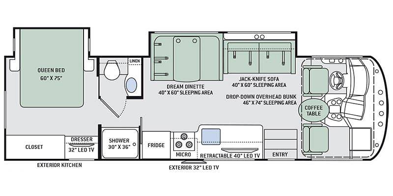 Equipped with a fuel capacity of 303 liters, this RV is ready to take you on extended journeys without frequent stops, allowing you to focus on the adventure ahead. The thoughtfully designed interior features ample sleeping arrangements, including a master bedroom, convertible sofa, and overhead bunk, ensuring everyone has a comfortable place to rest. The well-appointed kitchen and dining area make meal preparation and family dining a breeze, while the bathroom offers the convenience of home on the road.