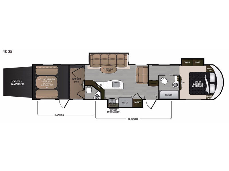 Are you ready to embark on unforgettable adventures with family and friends? Meet the 2018 Dutchmen RV Voltage V4005 Fifth Wheel, your perfect travel companion! This spacious and luxurious RV is designed to make every journey comfortable and enjoyable, with plenty of room for everyone. With three slide-outs, the Voltage V4005 offers an expansive living area that can comfortably sleep up to eight people, making it ideal for family trips or group getaways.