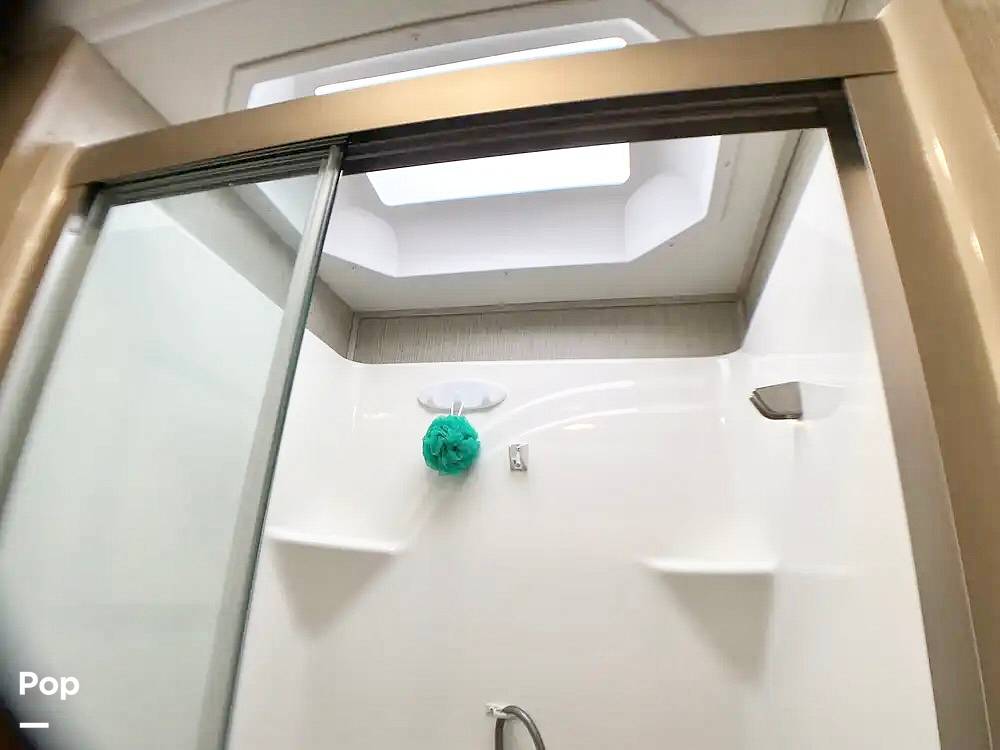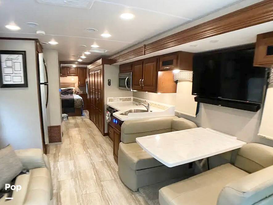 Step inside to discover a thoughtfully designed interior that maximizes space and functionality. The living area is adorned with high-quality furnishings and finishes, providing a welcoming atmosphere for relaxation and entertainment. The well-appointed kitchen features modern appliances, ensuring you can prepare meals with ease. Sleeping arrangements are versatile, with a master bedroom, bunk beds, and convertible sleeping spaces that cater to families and groups of various sizes. The bathroom is equipped with all the essentials, ensuring convenience and privacy on the road.