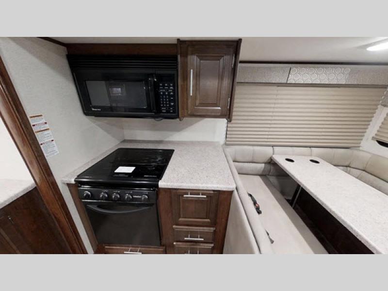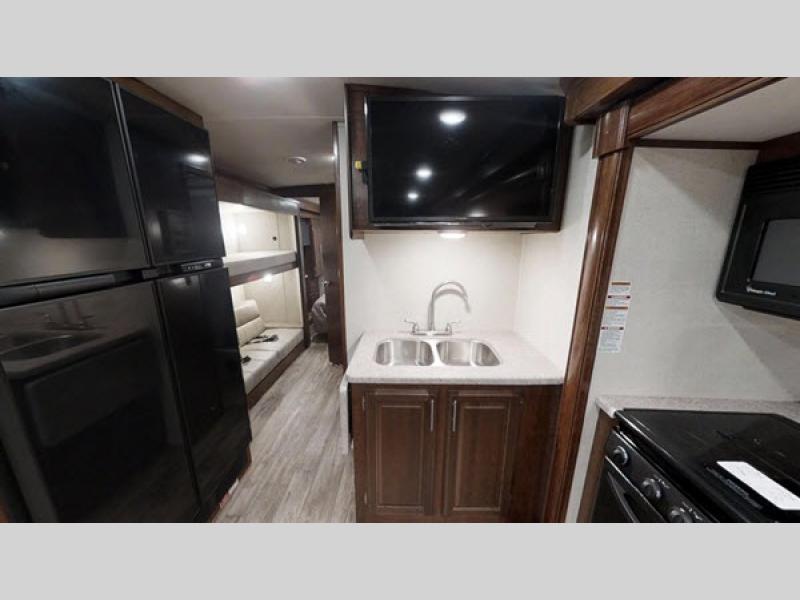This RV features two slide-outs that expand your living space, making it feel like a cozy home away from home. With the ability to sleep up to 11 people, it's perfect for family trips or a getaway with friends. The sleeping arrangements include a king-sized bed, bunk beds, a convertible sofa, and a dinette that transforms into a bed. Everyone will have their own space to relax after a day of exploring.