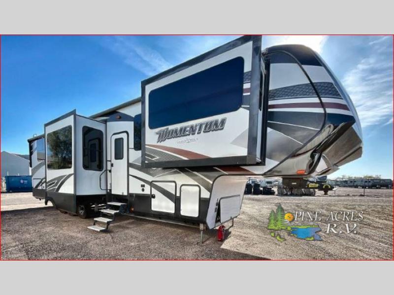 Looking for the ultimate adventure companion? Check out this 2018 Grand Design Momentum 376TH Toy Hauler Fifth Wheel! This beast is ready to take you and your toys on the road in style and comfort. With five slide-outs, this RV offers plenty of space for you and your crew to spread out and relax. Whether you're planning a weekend getaway or an extended road trip, this RV has got you covered.