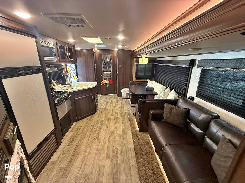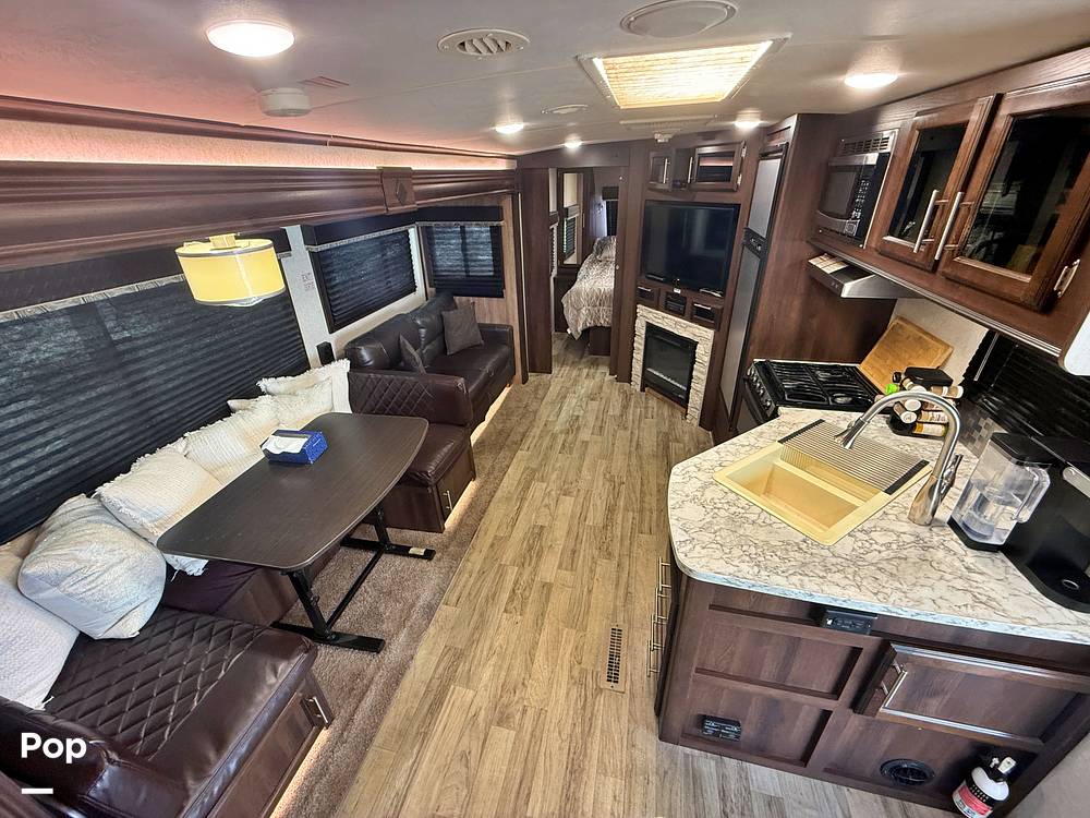 Inside, you'll find a thoughtfully designed interior that maximizes both space and functionality. The living area is equipped with a cozy seating arrangement, perfect for relaxing after a day of adventure. The kitchen features modern appliances, including a refrigerator, microwave, and stove, allowing you to prepare meals just like at home. The sleeping arrangements are versatile, with a comfortable queen-sized bed, convertible dinette, and a sofa bed, ensuring everyone has a restful night's sleep.