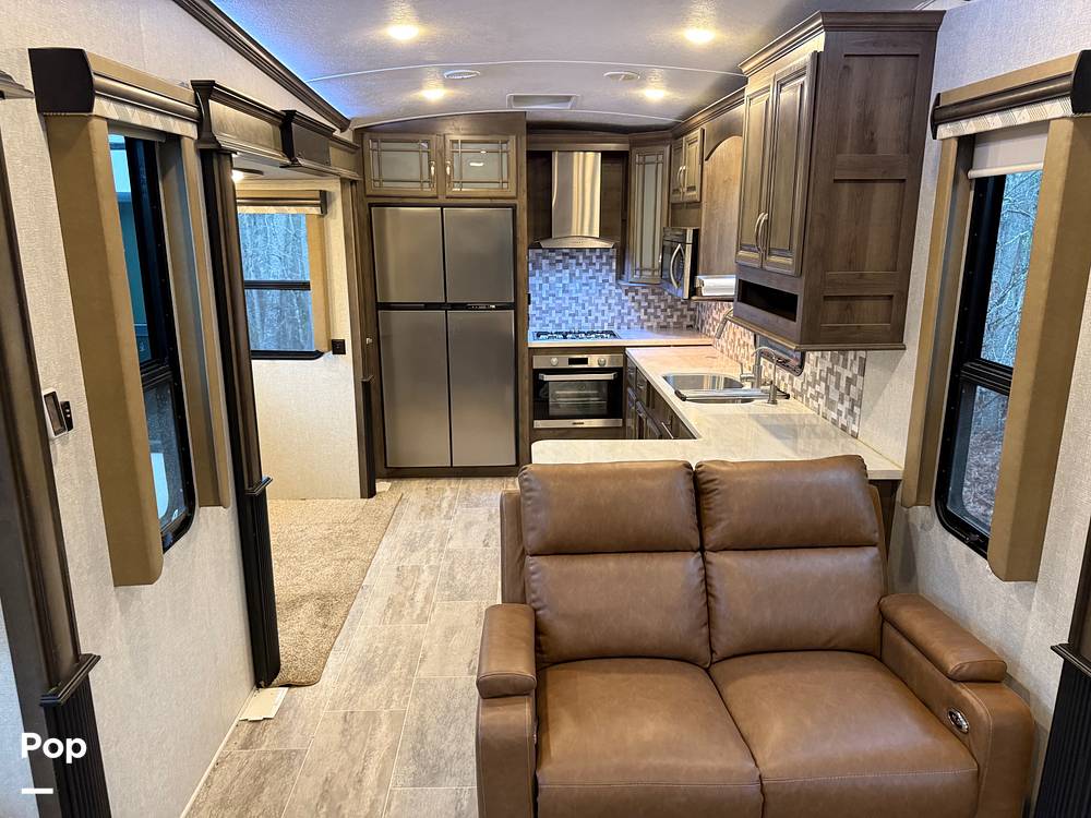 Inside, you'll find a well-appointed interior that boasts a sophisticated design and quality finishes. The living area is equipped with plush seating, perfect for relaxation after a day of adventure. The kitchen is a culinary enthusiast's dream, featuring modern appliances, generous counter space, and ample storage, making meal preparation a breeze. The dining area is thoughtfully designed to provide a comfortable space for family meals or entertaining guests.