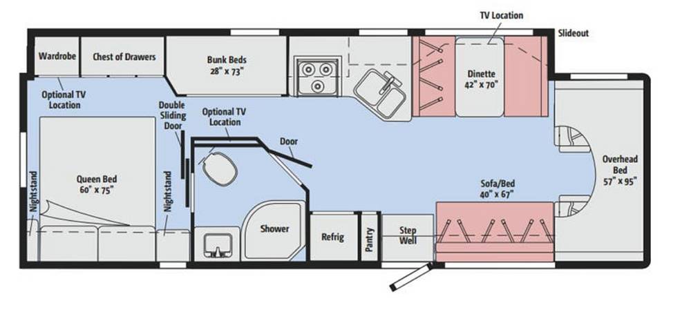 This RV is equipped with a massive fuel capacity of 208 liters, so you can travel further without constantly stopping for gas. At 27 feet long, it strikes the perfect balance between spaciousness and maneuverability, making it easy to drive and park. Inside, you'll find all the comforts of home, including a fully equipped kitchen, cozy sleeping areas, and plenty of storage for all your gear. Whether you're cooking up a feast or settling in for a movie night, the Minnie Winnie has got you covered.
