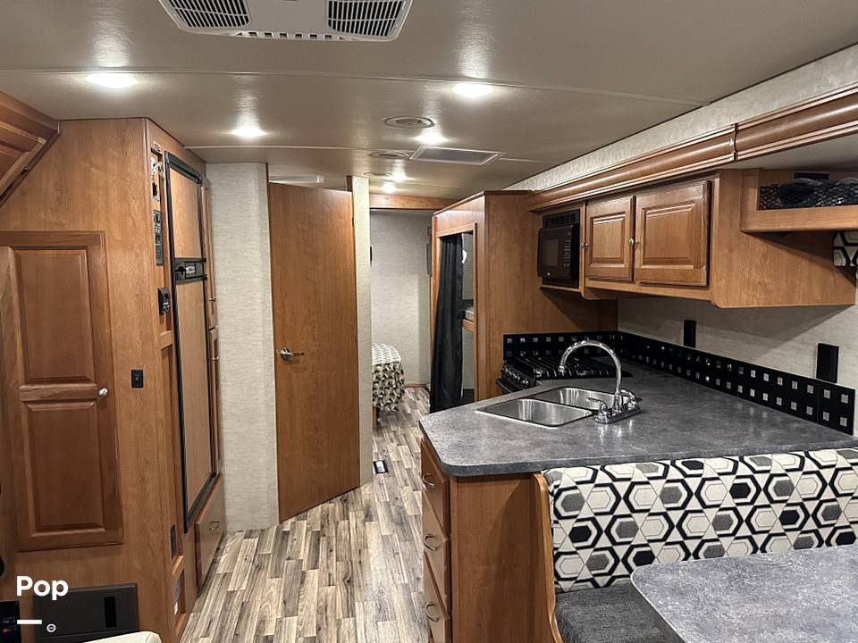 Step inside and be greeted by a spacious and thoughtfully designed interior. The Vista 31BE features a fully equipped kitchen with modern appliances, including a refrigerator, microwave, and stovetop, ensuring you can prepare delicious meals wherever you roam. The cozy living area is perfect for relaxation, with plush seating and a flat-screen TV for entertainment on the go. The sleeping arrangements are versatile and comfortable, with a master bedroom, convertible dinette, sofa bed, and bunk beds, ensuring everyone has their own space to unwind.