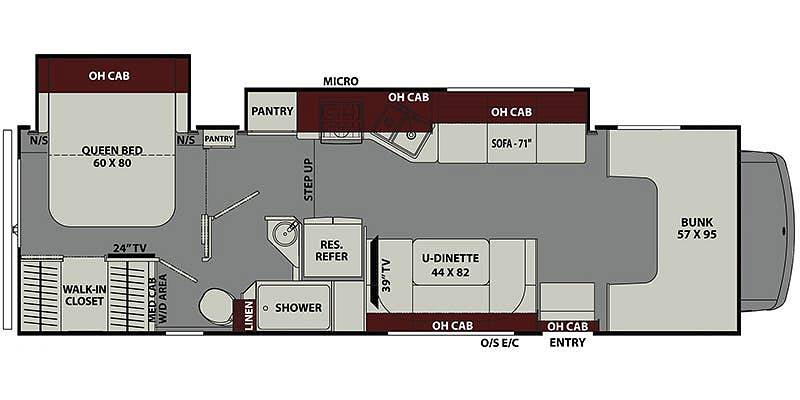 Inside, you'll find a thoughtfully designed living space equipped with all the amenities you need for a comfortable journey. The well-appointed kitchen features a refrigerator, microwave, and stovetop, allowing you to prepare meals with ease. The cozy dinette and sofa provide ample seating for dining and relaxation, while the entertainment system ensures everyone stays entertained on long drives or rainy days. The sleeping arrangements include a queen-sized bed, convertible dinette, and a cab-over bunk, ensuring restful nights for everyone on board.