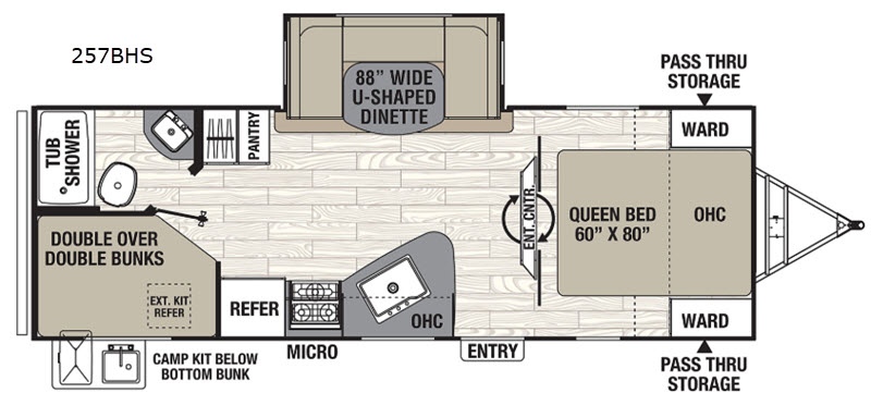 Step inside to discover a thoughtfully designed interior that maximizes space and functionality. The Freedom Express 257 BHS features a well-appointed kitchen equipped with a refrigerator, microwave, and a three-burner stove, ensuring you have all the essentials to prepare delicious meals. The dinette area comfortably seats four and can be converted into an additional sleeping space. The master bedroom offers a cozy queen-sized bed, while the bunkhouse provides two double-sized bunks, accommodating up to eight people in total. The bathroom is complete with a shower, sink, and toilet, offering all the comforts of home.