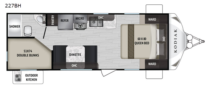Measuring 22 feet in length, the Kodiak Ultra-Lite is compact enough for easy towing yet spacious enough to ensure everyone has room to relax. Its lightweight design, weighing just 1,944 kilograms, makes it a breeze to tow with a variety of vehicles, enhancing your travel flexibility. Inside, you'll find a thoughtfully designed layout that maximizes space and functionality. The cozy sleeping arrangements include a queen-sized bed, bunk beds, and convertible dinette, ensuring a restful night's sleep after a day of adventure.