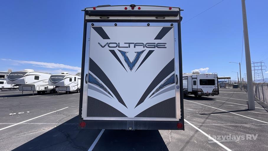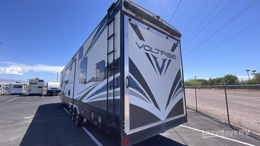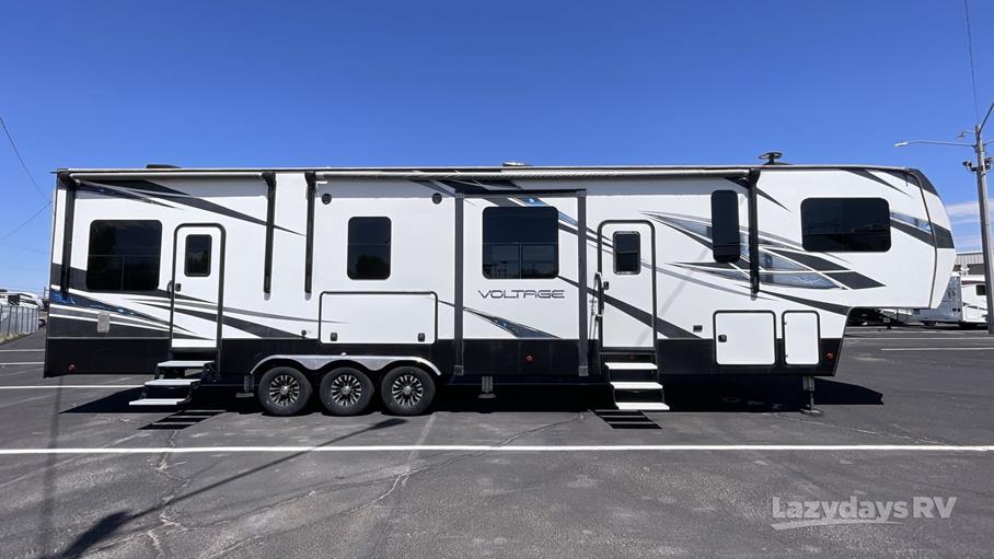 The Voltage 4115 features two slide-outs, expanding your living space and providing a roomy, comfortable environment. Inside, you'll find a well-appointed interior with modern amenities, including a fully equipped kitchen, a cozy living area, and a luxurious master bedroom. The kitchen boasts high-quality appliances and plenty of storage, while the living area is perfect for relaxing or entertaining guests. The master bedroom offers a peaceful retreat with a comfortable bed and ample closet space.
