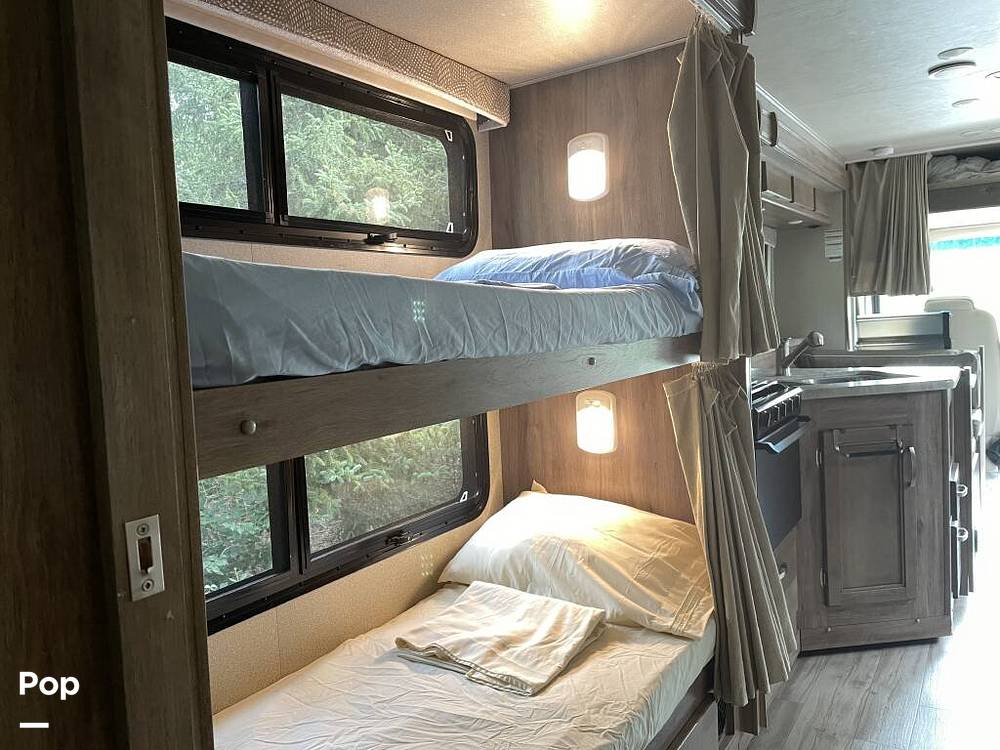 Inside, you'll find a well-appointed living space featuring modern amenities and thoughtful design. The kitchen is equipped with a refrigerator, microwave, and stove, allowing you to prepare meals with ease. The cozy dinette and sofa provide ample seating for dining and relaxation, while the overhead bunk and convertible furniture offer versatile sleeping arrangements. The private bedroom, complete with a comfortable queen-sized bed, ensures restful nights on the road.