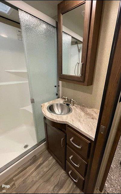 Inside, you'll find a cozy and inviting interior that feels just like home. The living area is perfect for relaxing after a day of exploring, with plush seating and a large entertainment center. The kitchen is fully equipped with modern appliances, making meal prep a breeze. Plus, there's plenty of storage space for all your travel essentials. The separate bunkhouse is a fantastic feature, offering privacy and extra sleeping quarters for the kids or guests.