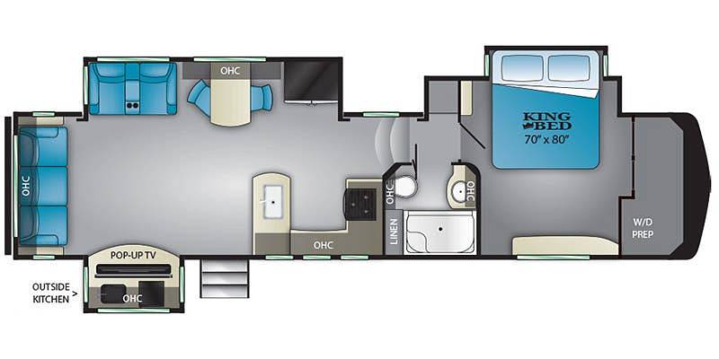 Inside, the Heartland Bighorn 32CK comfortably sleeps up to four people, making it perfect for families or couples seeking a cozy escape. The interior boasts a well-appointed living area with plush seating and a modern entertainment system, ensuring relaxation after a day of exploration. The kitchen is equipped with high-quality appliances and generous counter space, allowing you to prepare meals with ease. The elegant dining area is perfect for enjoying meals together or planning your next adventure.