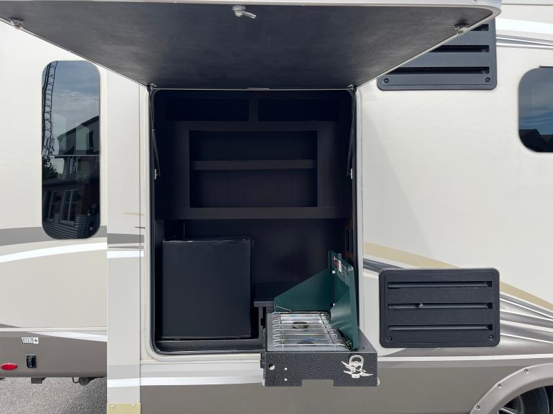 Step inside to discover a thoughtfully designed interior that maximizes space and comfort. The living area features plush seating and a state-of-the-art entertainment system, creating the perfect setting for relaxation after a day of exploration. The kitchen is equipped with modern appliances, including a refrigerator, microwave, and oven, all seamlessly integrated into the elegant cabinetry. The dining area provides ample space for meals, making it ideal for family gatherings or entertaining guests. The bedroom offers a tranquil retreat with a comfortable queen-sized bed, abundant storage, and tasteful decor, ensuring restful nights on the road.
