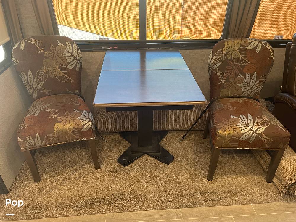 Step inside to find a beautifully appointed living area featuring plush seating and a cozy fireplace, perfect for unwinding after a day of adventure. The kitchen is a chef’s dream, equipped with modern appliances including a full-sized refrigerator, microwave, and oven, all set within elegant cabinetry. The dining area provides a comfortable space for meals and gatherings, making it feel like a home away from home. The master bedroom offers a tranquil retreat with a king-sized bed and generous storage, ensuring you have everything you need for extended trips.