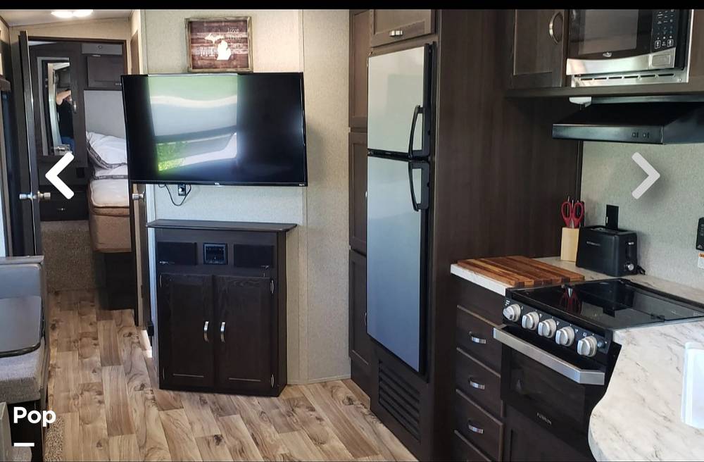 Inside, you'll find a well-thought-out layout that comfortably sleeps up to four people. The inviting living area features plush seating, perfect for relaxing after a day of adventure. The kitchen is equipped with modern appliances, including a refrigerator, microwave, and stove, ensuring you can prepare your favorite meals with ease. Ample storage throughout the trailer ensures you have plenty of space to store all your essentials, keeping your living area clutter-free.