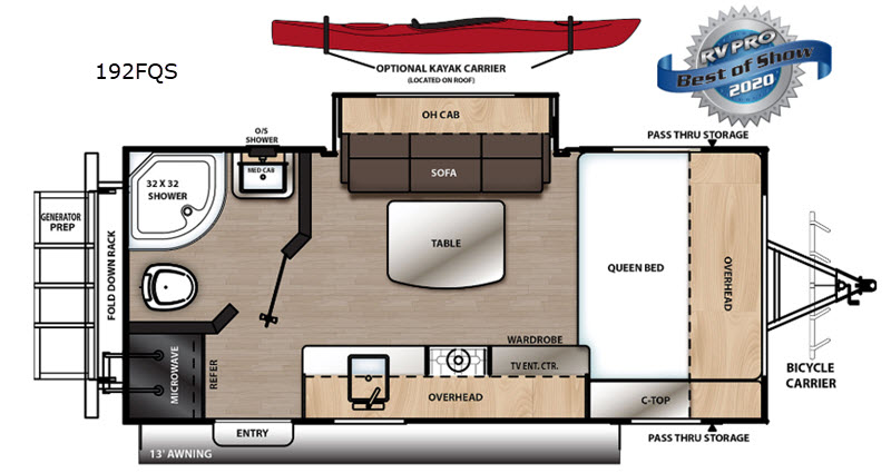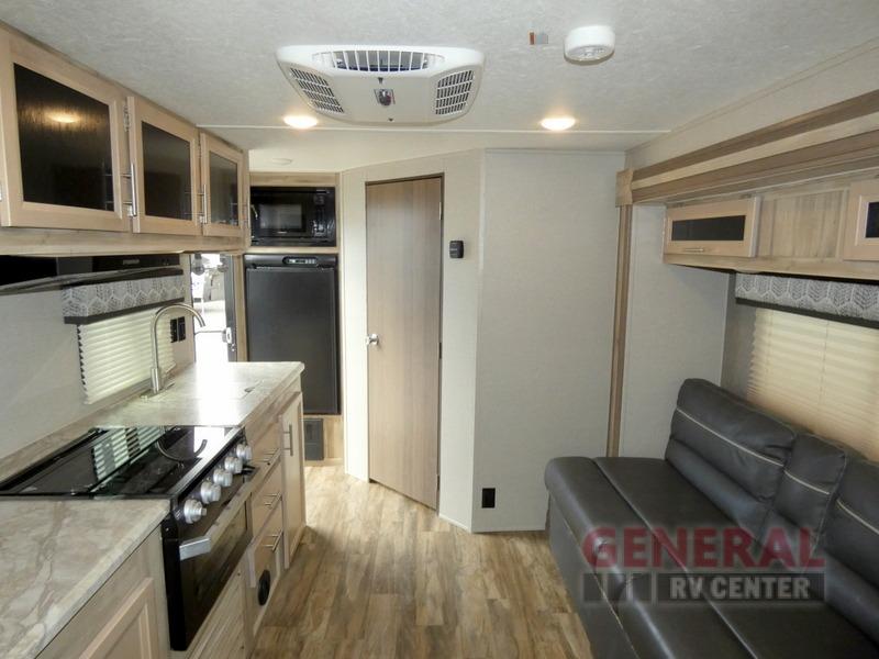 The Catalina Expedition 192FQS features one slide-out, which significantly enhances the living space, creating an inviting environment for relaxation and entertainment. Designed to accommodate up to three people, this travel trailer is ideal for couples or small families seeking a cozy retreat. The interior is thoughtfully arranged, offering a well-appointed kitchen, a comfortable sleeping area, and a functional bathroom, ensuring all your needs are met while on the go.