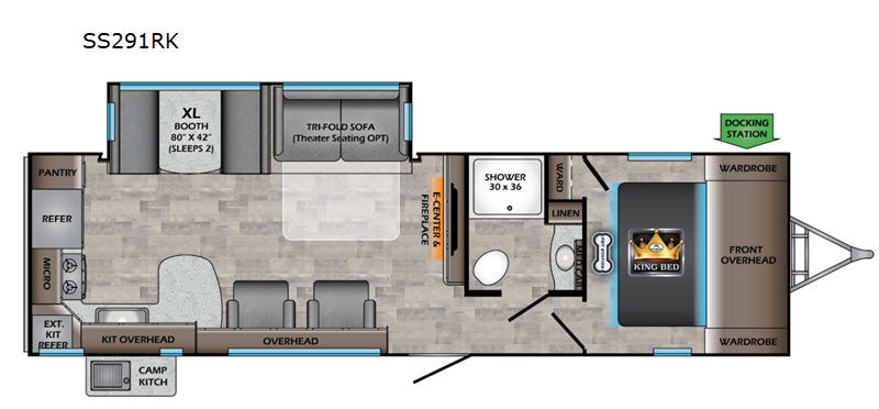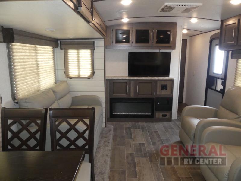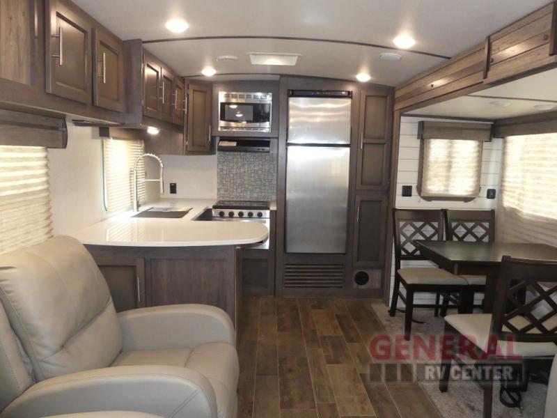The Sunset Trail SS291RK features a single slide-out that significantly enhances the interior space, providing a roomy and inviting atmosphere. Designed to comfortably sleep up to four people, this travel trailer is perfect for small families or couples looking to explore the great outdoors without sacrificing the comforts of home. The well-appointed rear kitchen is equipped with modern amenities, ensuring that meal preparation is both convenient and enjoyable.