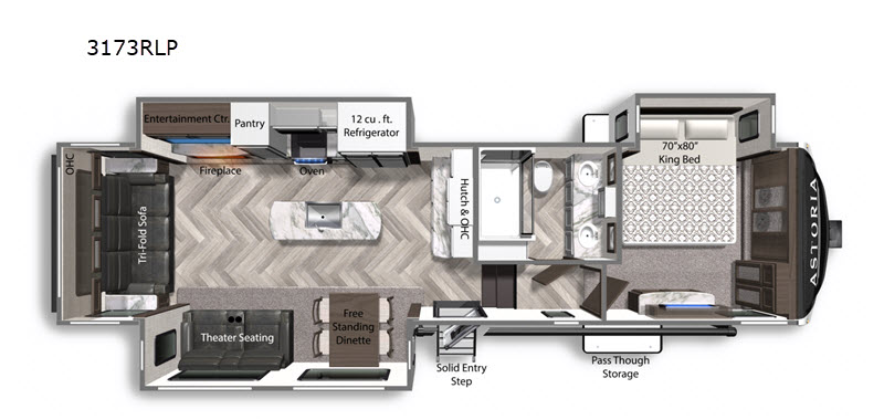 The Astoria 3173RLP features three expansive slide-outs, significantly enhancing the living space and creating an open, airy atmosphere. Inside, you'll find accommodations to comfortably sleep four, making it ideal for small families or couples seeking a premium travel experience. The interior is thoughtfully designed with high-quality finishes and modern amenities, ensuring a home-like feel even while on the move. The well-appointed kitchen, cozy living area, and elegant bathroom provide all the comforts of home, while the spacious bedroom offers a restful retreat after a day of exploration.