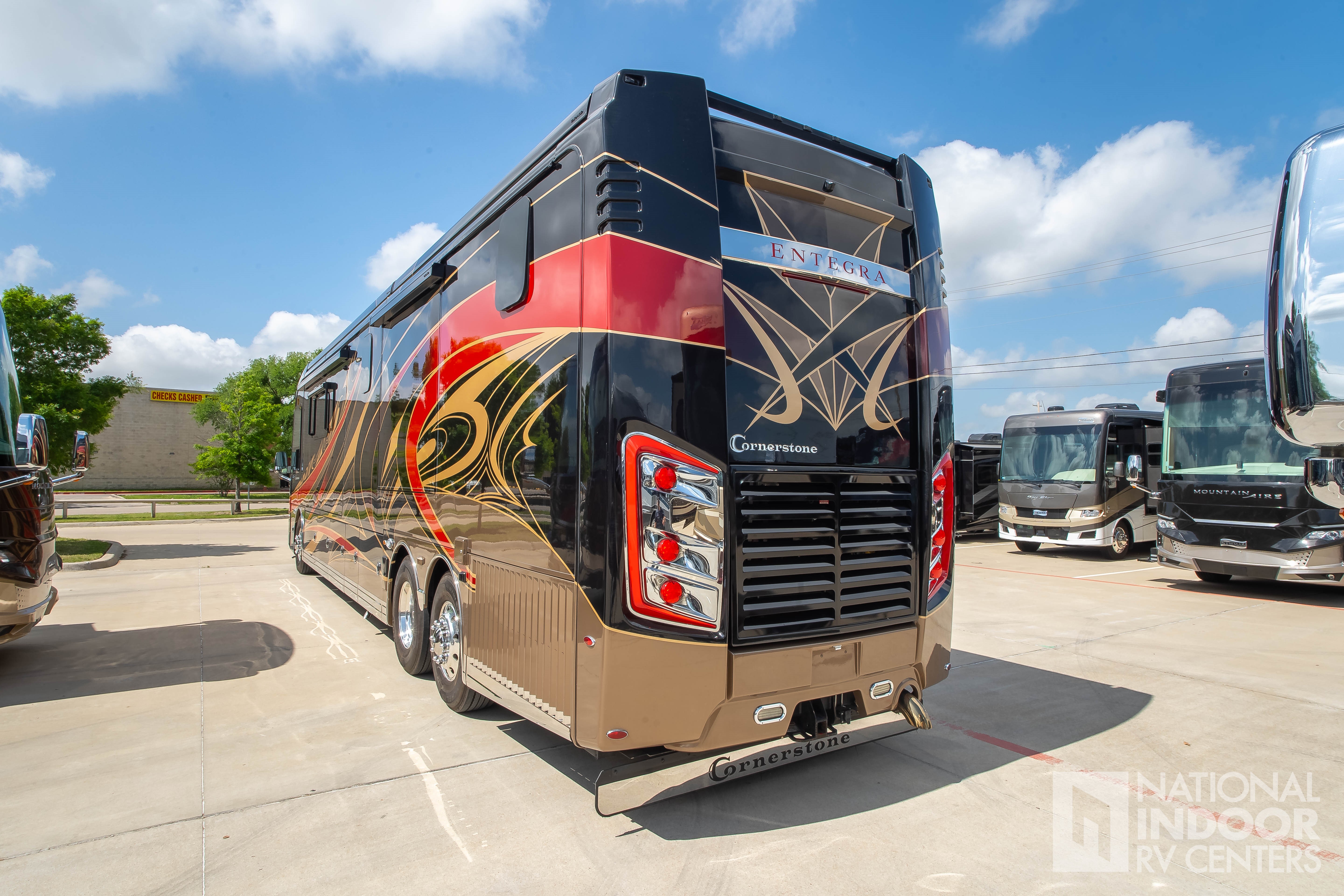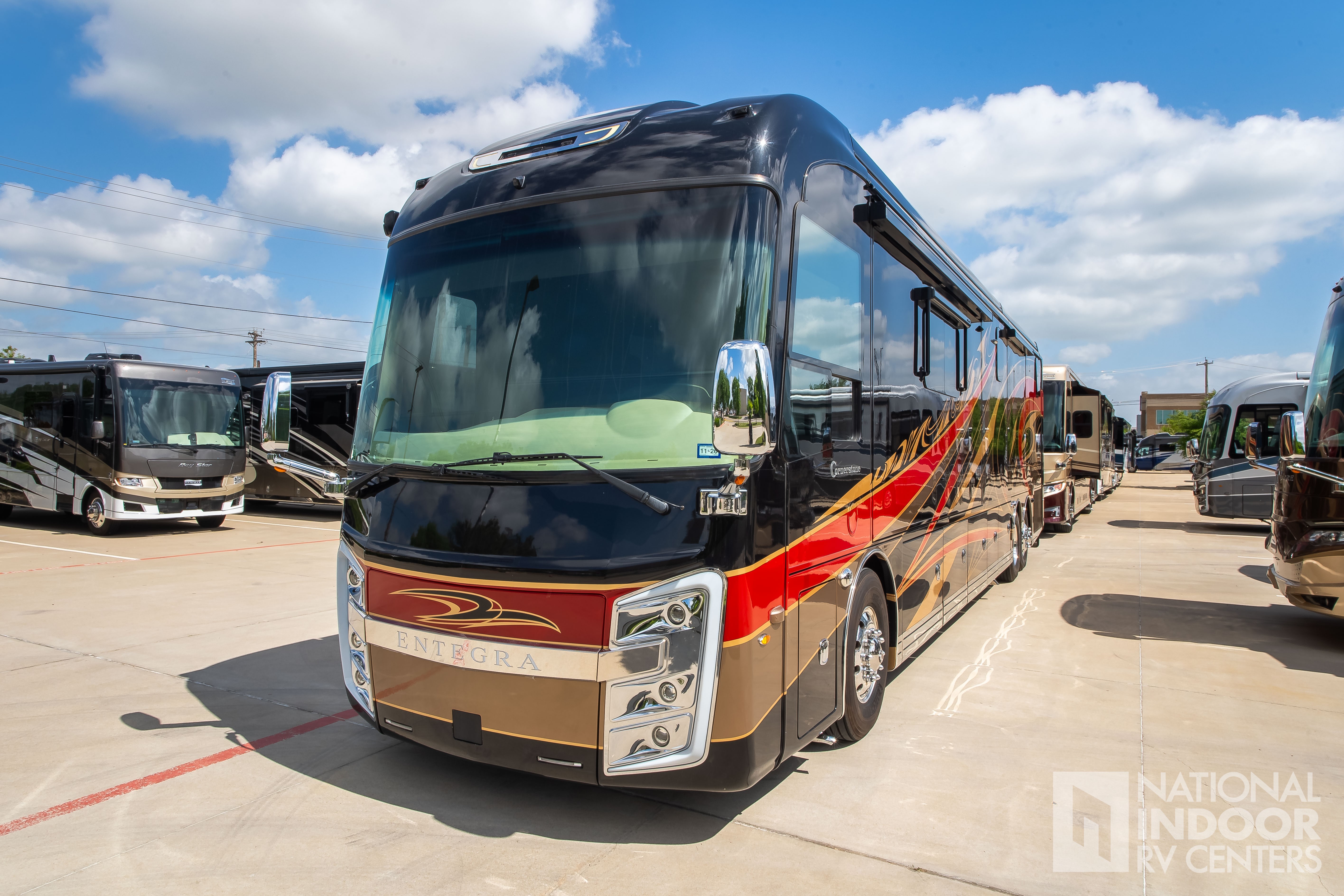 The Entegra Cornerstone 45B features four spacious slide-outs, offering a generous increase in living space at the push of a button. Inside, you'll find a beautifully appointed interior with high-end finishes and modern amenities. The well-equipped kitchen boasts top-of-the-line appliances, perfect for preparing gourmet meals. Relax in the plush living area, complete with comfortable seating and a state-of-the-art entertainment system. The master suite offers a private retreat with a luxurious king-size bed and ample storage.