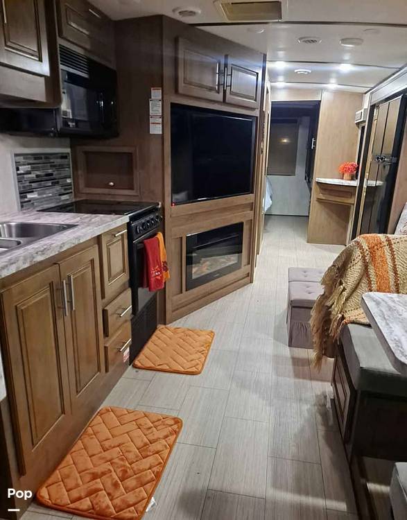 Inside, you'll find a well-appointed living area that feels like a home away from home. The kitchen is equipped with modern appliances, including a refrigerator, stove, and microwave, making meal prep a breeze. The cozy dinette is perfect for family meals or game nights, while the plush seating area invites you to relax and unwind after a day of adventure. The master bedroom offers a comfortable retreat with a queen-sized bed, and the additional sleeping areas ensure everyone has their own cozy spot to rest.