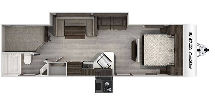 Inside, the Grey Wolf 26DBH boasts a thoughtfully designed layout that can comfortably sleep up to 10 individuals, making it perfect for large families or group adventures. The interior features a master bedroom with a queen-sized bed, double bunk beds, a convertible dinette, and a sofa bed, ensuring everyone has a cozy place to rest. The kitchen is equipped with modern appliances, including a refrigerator, microwave, and stovetop, allowing you to prepare meals with ease. The bathroom offers a full shower and toilet, providing the convenience of home while on the road.