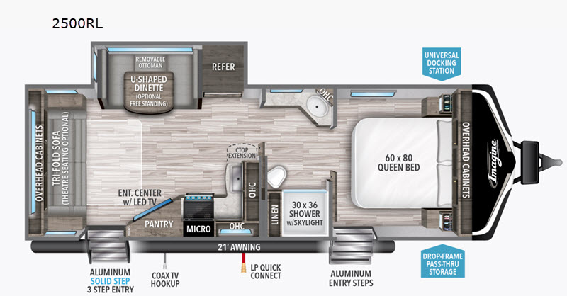 Measuring approximately 24 feet in length, the Imagine 2500RL is compact enough for easy towing yet spacious enough to accommodate up to six sleepers comfortably. Whether you're traveling with family or friends, everyone will have a cozy spot to rest after a day of exploring. The smart layout includes a queen-sized bed, convertible dinette, and a plush sofa, ensuring everyone has a place to unwind.